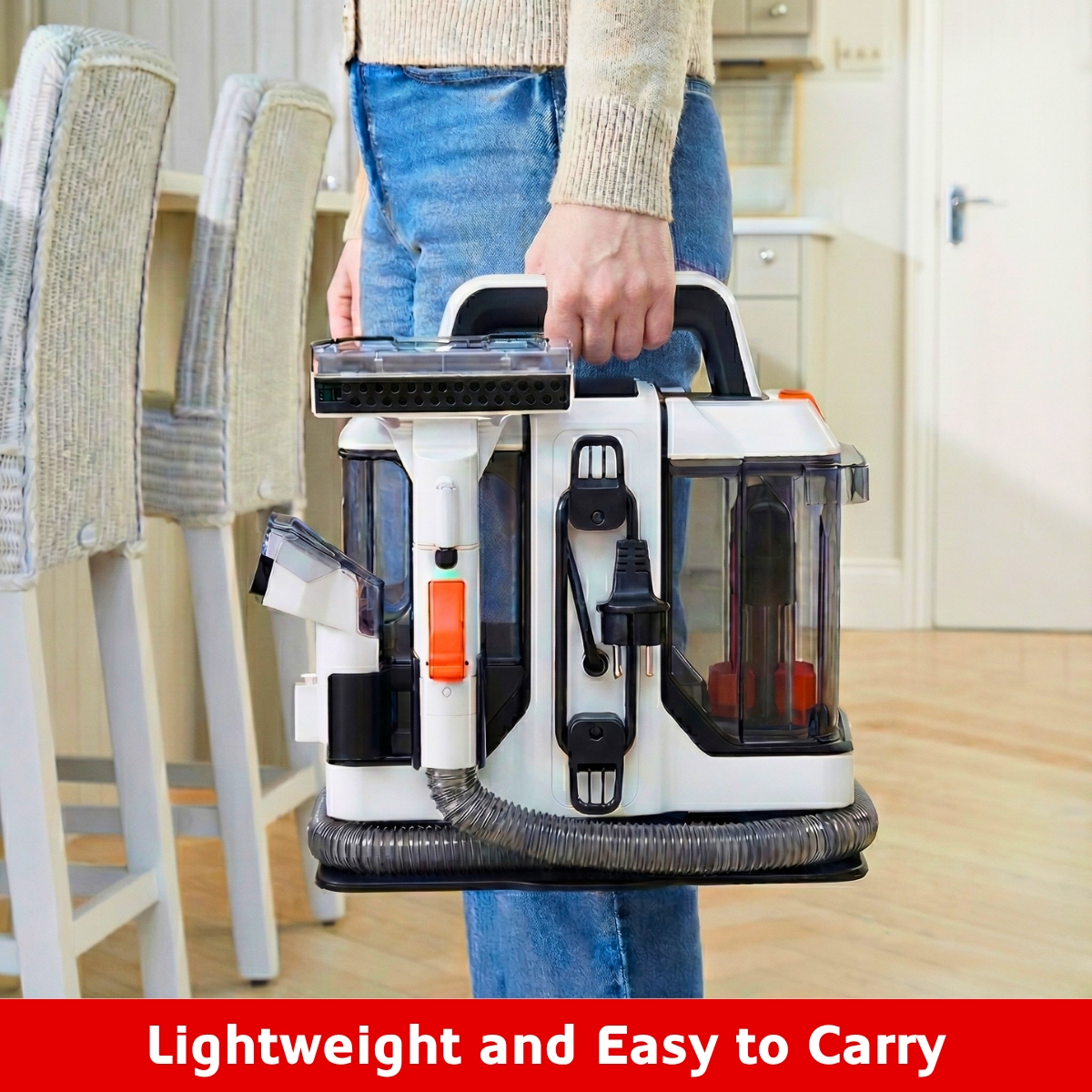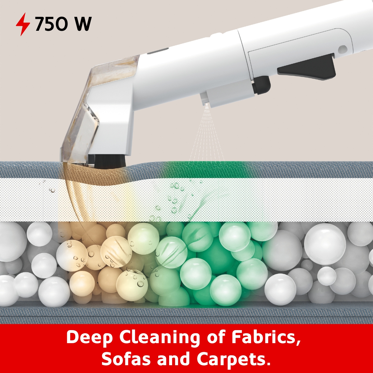 Aspira líquidos e sujidade com potência intensa, garantindo uma limpeza profunda e rápida em todo o tipo de tecidos.