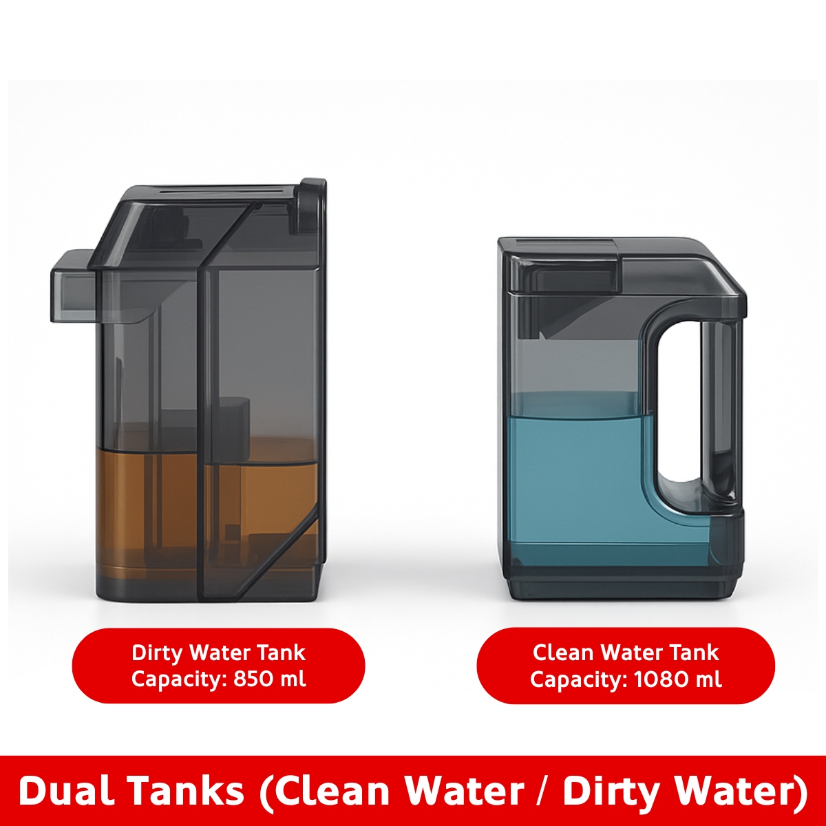 Dispõe de dois reservatórios separados: um para água limpa (1080 ml) e outro para água suja (850 ml), mantendo a higienização constante durante toda a utilização.
